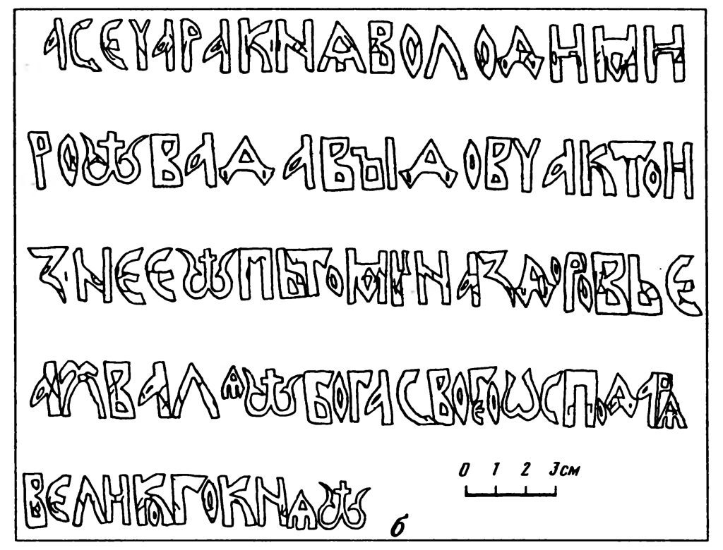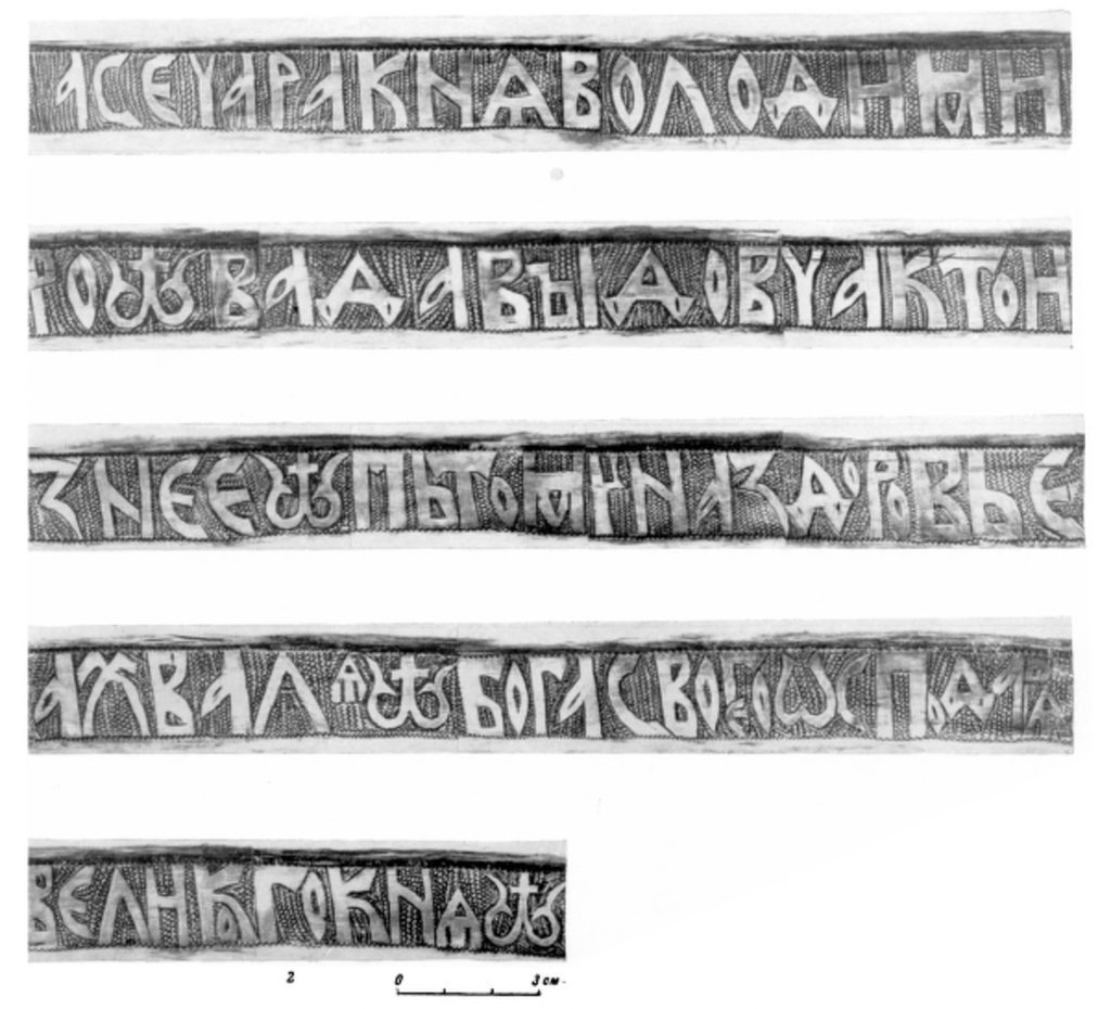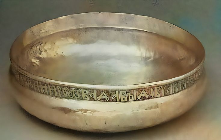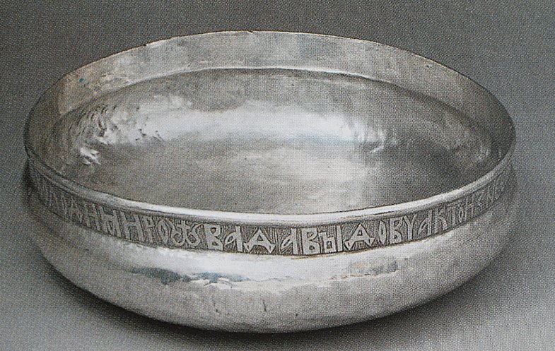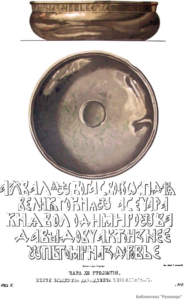 Кн. Володимиру Давыдовичу принадлежала огромная серебряная чара с заздравной надписью: «а се чара кнѧ Володимиро|im.|ва Давꙑдовча кто из нее |im.| пь тому на здоровье а хвалѧ |im.| Бога своего ѡсподарѧ великого кнѧ |im.|», хранящаяся с середины XIX века в Оружейной палате, а до того находившаяся в Эрмитаже.25 В научный оборот чара была введена в 1851 году А. Ф. Бычковым26, который датировал памятник 1139–1151 годов — временем правления черниговского князя Владимира Давыдовича, известного по летописям27. Однако Анатолий Турилов28 по совокупности орфографических и собственно палеографических примет надписи на чаре датирует не